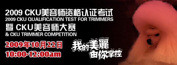 2009年10月22日,中国宠物美容精英将汇聚第二届CKU美容师资格认证考试暨CKU美容师大赛。届时,CKU将邀请国际权威美容审查员执裁,并采取通过公平、公正、公开的考试模式。通过考试的国内宠物美容行业的佼佼者,将有资格申领目前国内最具权威性的美容师资格认证证书。各等级的前三名将获得CKU颁发的美容师大赛的奖杯及奖品!这将是一场竞技与友谊并存的赛事,更是一场令广大爱犬者期待已久的盛会。